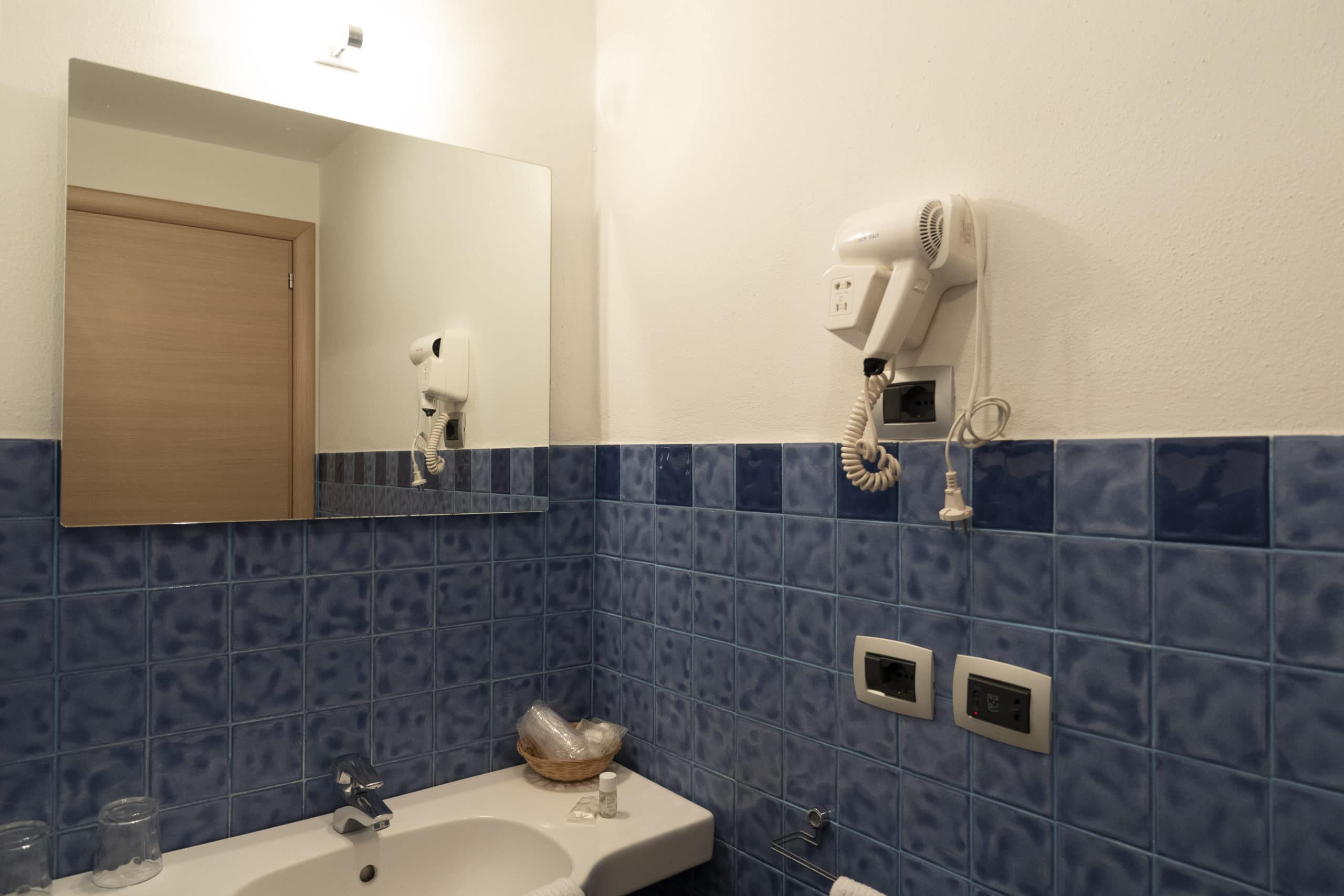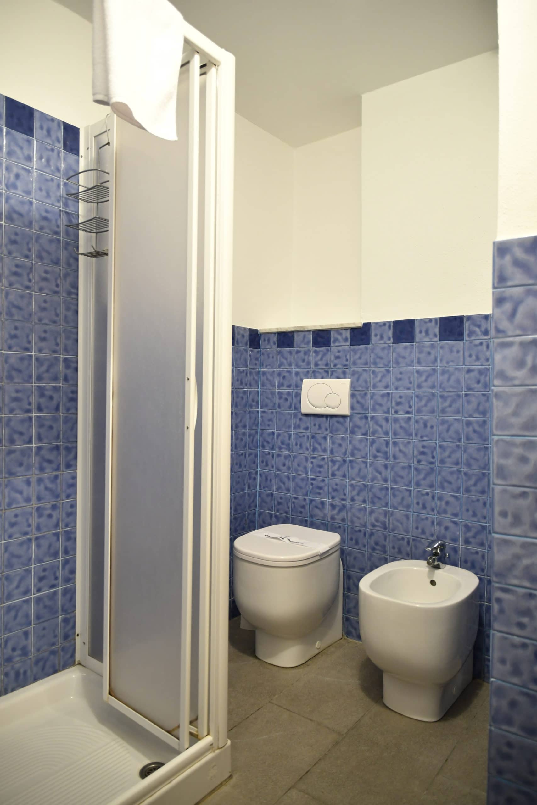 La scrivania ha tutto il necessario — bollitore, acqua, frigobar — e l’armadio è capiente per chi si ferma più di una notte. Il bagno è generoso: box doccia ampio con soffione a pioggia, piastrelle blu, scaldasalviette e un lavabo largo con il suo kit di cortesia.