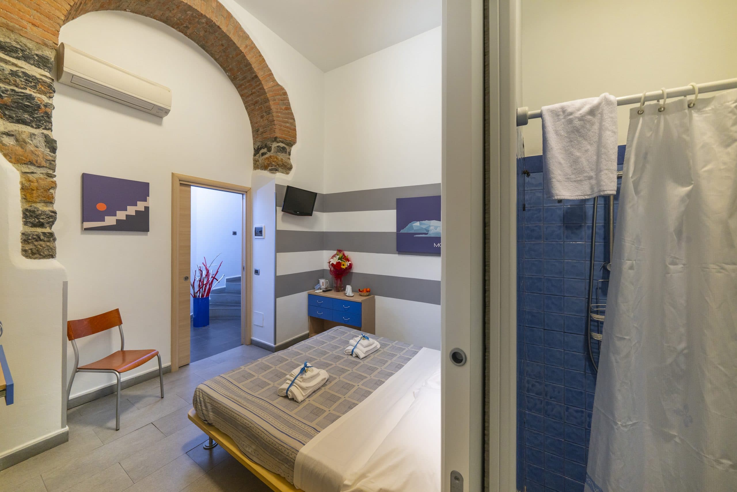 Monterosso è la camera che ti racconta la storia dell’edificio prima ancora che tu apra la valigia. L’arco in mattoni originale attraversa la stanza come un portale: da un lato il presente — linee pulite, pareti a righe, arredi essenziali — dall’altro il passato, con la pietra grezza dei pilastri che la ristrutturazione del 2023 ha voluto lasciare a vista.