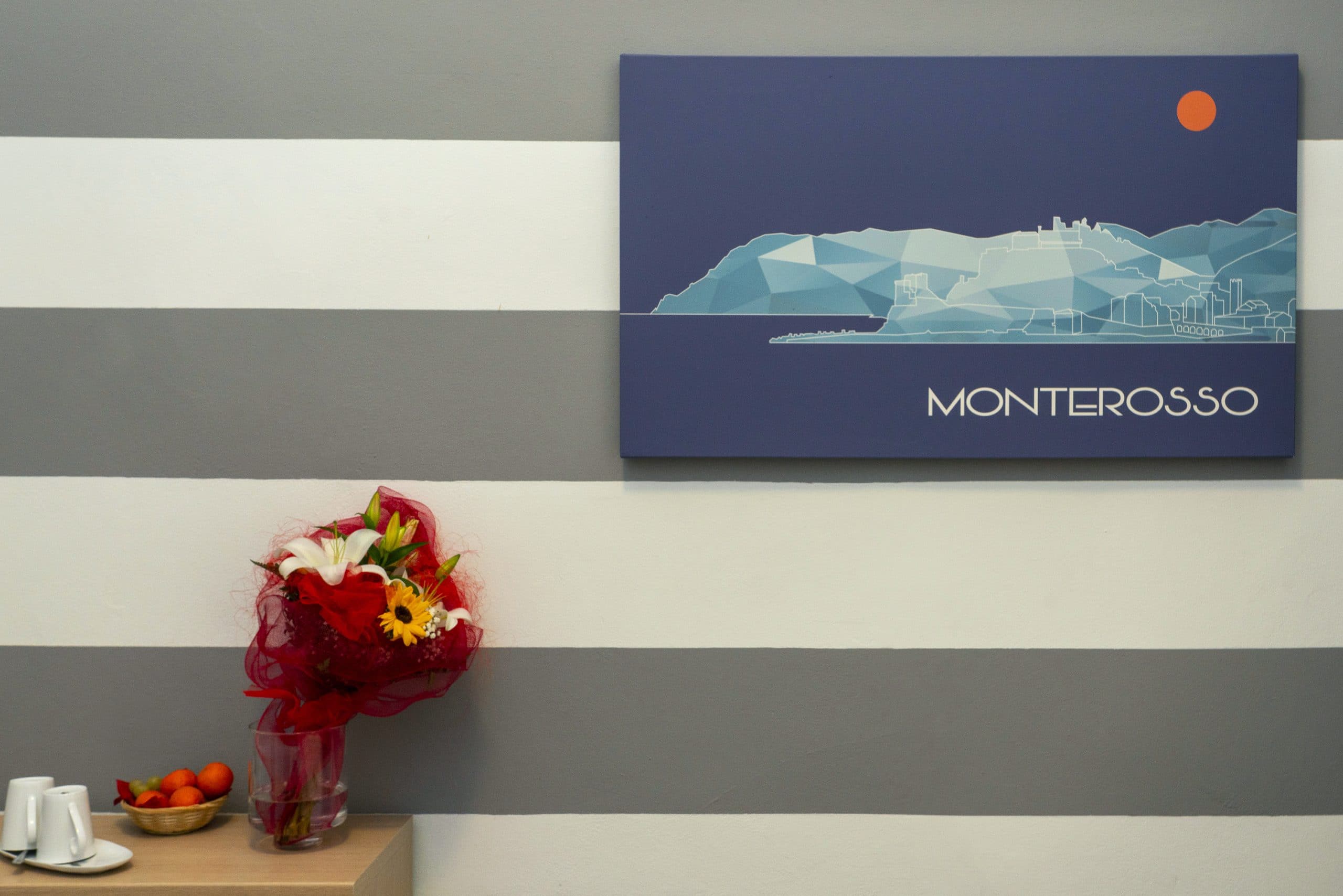 I quadri alle pareti riprendono il profilo costiero di Monterosso — il primo dei cinque borghi, quello con la spiaggia più grande, quello dove il mare si distende e prende fiato.