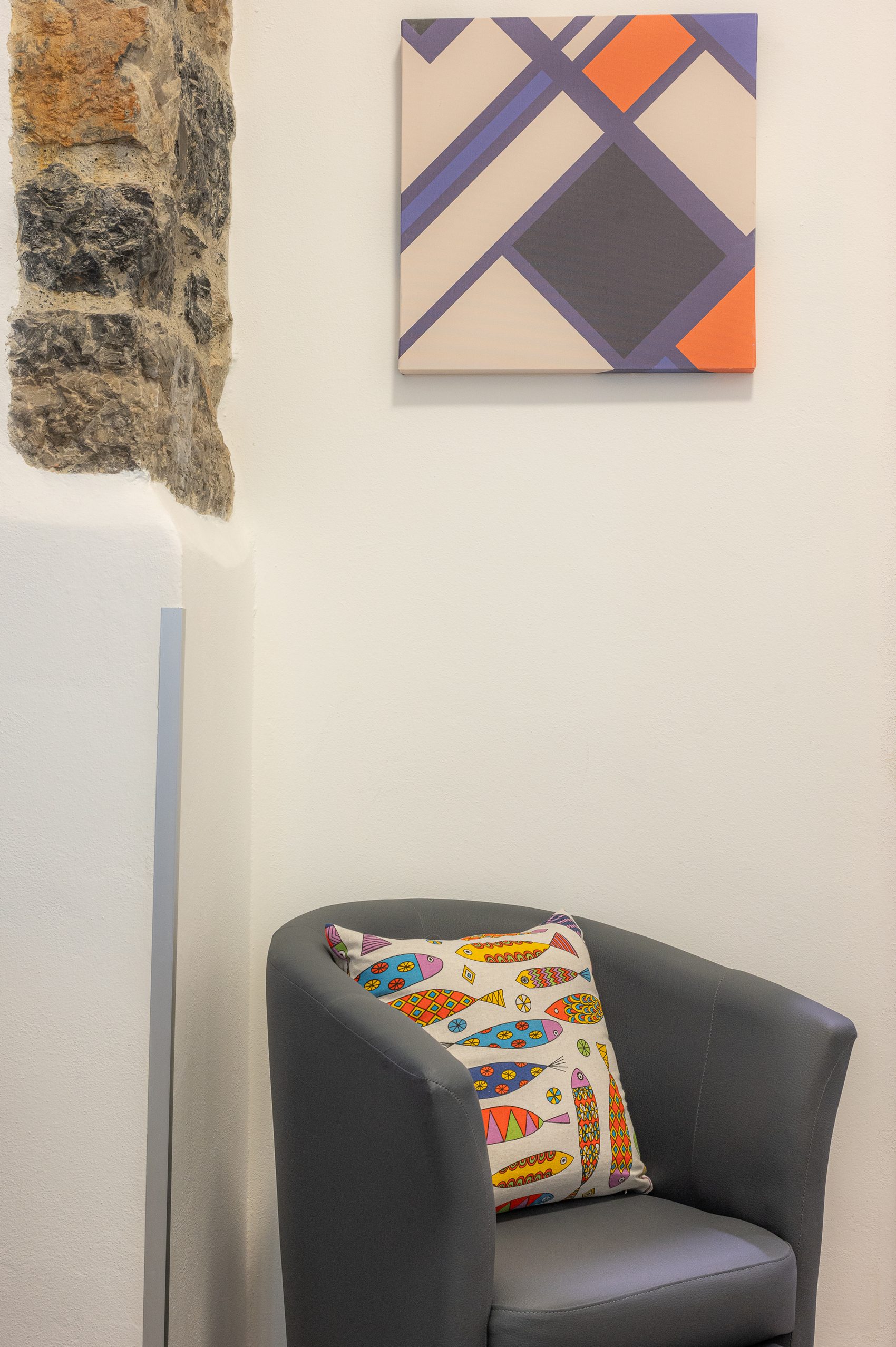 Sul letto grigio chiaro, gli asciugamani piegati ti aspettano. Nell’angolo, la poltroncina con il cuscino a pesci colorati mette un sorriso dove non te lo aspetti.